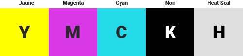 Ce ruban est composé de 5 panneaux : Jaune, Magenta, Cyan, Noir et Heat Seal.