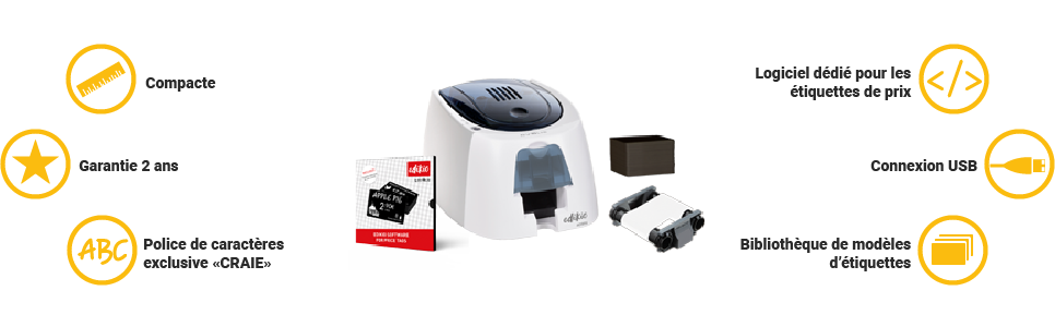 La solution tout-en-un la plus abordable pour créer et imprimer vos étiquettes de prix sur cartes plastiques. Idéale pour des besoins de petits volumes d’étiquettes en impression simple face.