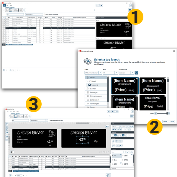 Vous pouvez indiquer facilement toutes les informations nécessaires aux consommateurs : dénomination des produits, origine, prix, unité de mesure, ingrédients, calories, allergènes…