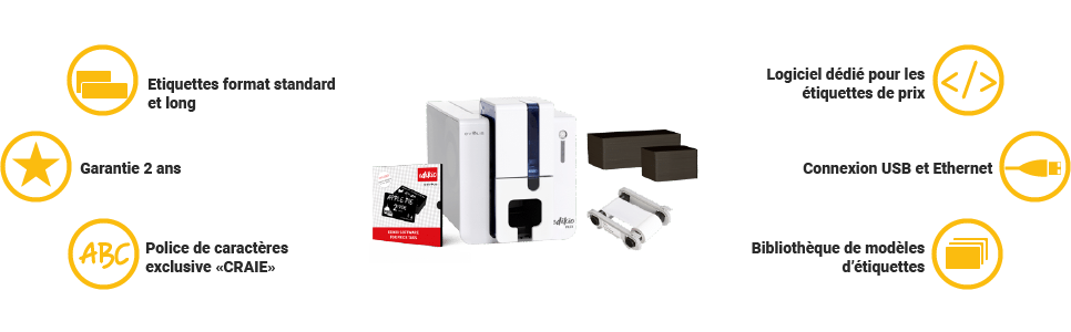 Capable de gérer un ou plusieurs format(s) d’étiquettes, l'imprimante Edikio Price Tag Flex émet des étiquettes simple face en qualité professionnelle. Son utilisation s'avère aussi simple que celle d’une imprimante de bureau standard. Bénéficiant de l'expérience et du contrôle qualité éprouvé d'Evolis, l'imprimante Edikio Price Tag Flex vous garantit un fonctionnement optimal et un résultat parfait.