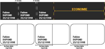 Grâce à la fonction d'économie de ruban, disponible avec les rubans continus, vous augmentez considérablement le nombre de cartes à imprimer avec un seul ruban. En effet, la surface utilisée sur le ruban correspond à la surface réelle plus un saut de 7 mm (0,27''), et non la surface d'une carte entière.