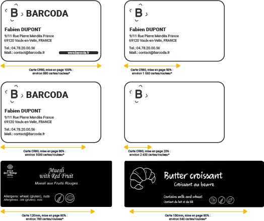 La plupart des rubans monochromes Evolis sont prévus pour une moyenne de 1000 impressions par rouleau. Cependant, en fonction de la mise en page, le ruban permet d'obtenir un nombre d'impressions différent, comme démontré ci-après :
