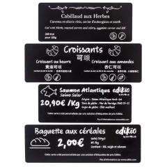 Grâce à leur surface d'écriture accrue, les cartes longues en PVC brillant d'Evolis sont idéales pour afficher clairement toutes les informations nécessaires aux consommateurs (ingrédients, prix, allergènes, méthode de production, etc.) en une ou plusieurs langues, et donner une image professionnelle à votre magasin ou établissement.