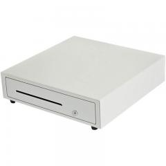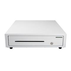 Tiroir-caisse avec ouverture avant, dimensions (LxHxP): 410x114x415mm, insert: 6 compartiments à billets, 8 compartiments à pièces, 1 compartiment à chèques, connecteur imprimante PDV, RJ12, couleur: blanc (brillant)