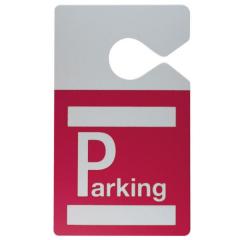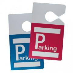 Badge véhicule avec accroche rétroviseur, imprimé "Parking" en réserve blanche sur fond couleur bénéficiant de 2 zones à personnaliser à l'aide d'un feutre indélébile ou d'une titreuse.
