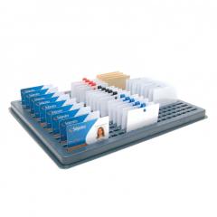 Plateau pour rangement de 76 badges format carte de crédit (86 x 54 mm) et badges conférence (quantité selon format carte), en PVC thermoformé noir avec couvercle cristal amovible. Livré dans un étui carton rigide. Idéal pour faciliter l'accueil de vos visiteurs ou participants lors d'événements, séminaires, salons, conférences, etc...