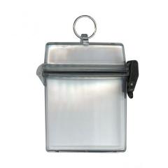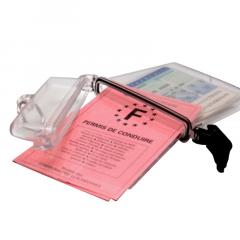 Porte pièces d'identité Clearbox. Ce boîtier étanche pour pièces d’identité, adapté au format carte d'identité, permis de conduire... est livré avec un anneau métal. Cordon noir (avec système de sécurité) en option.