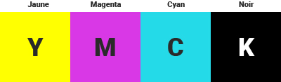 Le ruban couleurs est composé de 4 panneaux : Jaune (Y), Magenta (M), Cyan (C), Noir (K).