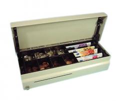 Tiroir-caisse avec ouverture en haut, 460x100x172mm, 4 compartiments à billets, 8 compartiments à pièces, 1 compartiment à reçus, serrure 2 positions, fermeture différente, série 800, couleur: blanc