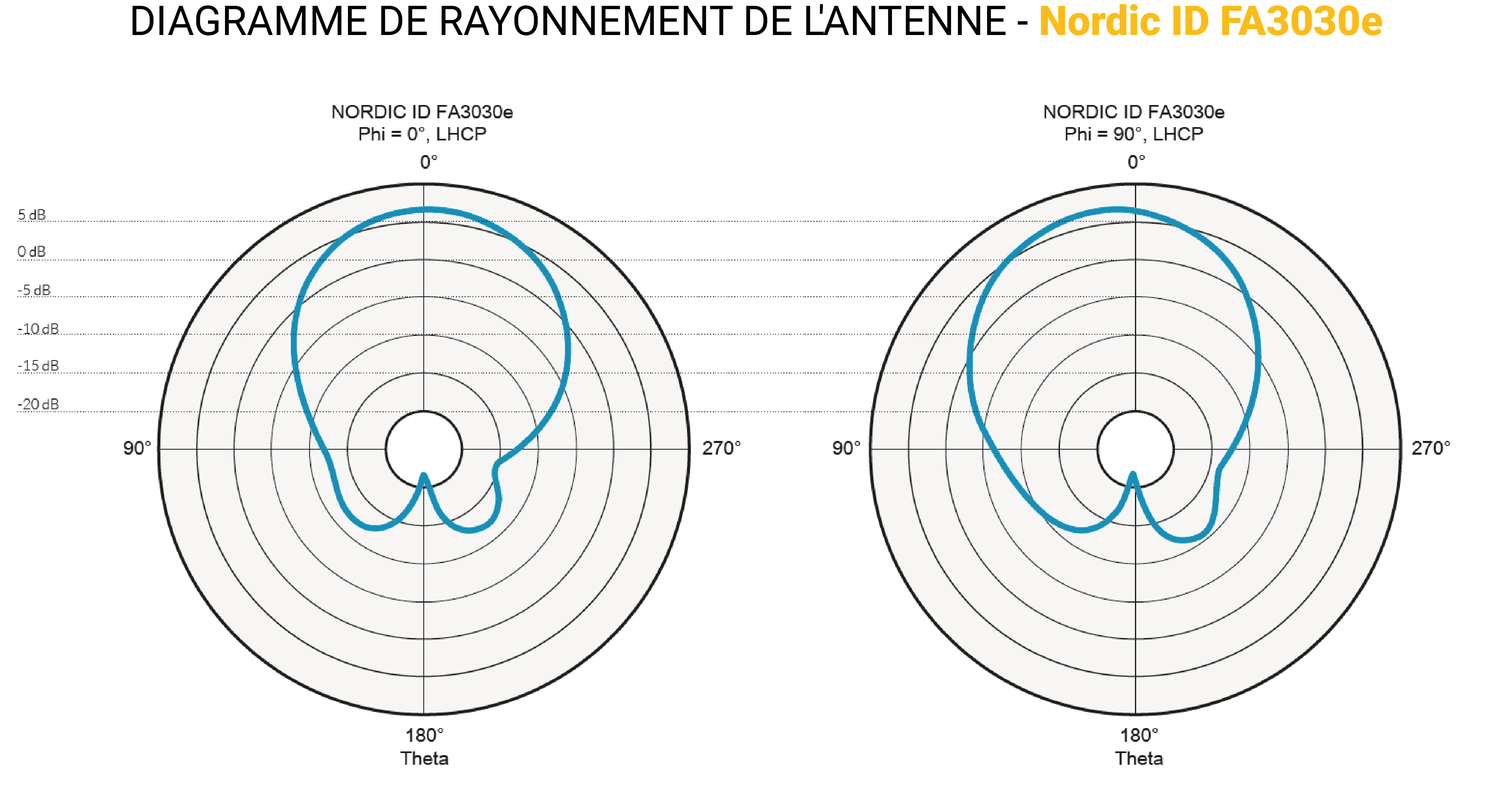 L'antenne Nordic ID FA3030e fonctionne avec la fréquence ETSI 865 – 868 MHz (norme Européenne). Elle présente une polarisation circulaire, une puissance d'entrée maximale de 10 W et est équipée d'un connecteur SMA femelle.