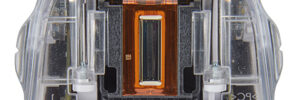 La tête d'impression est intégrée dans la cartouche et visible sur la face inférieure de l'e-mark.