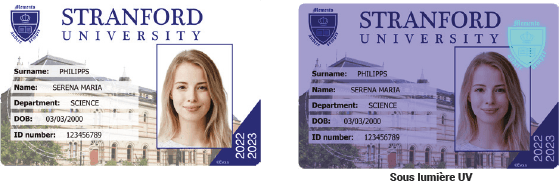 Le ruban YMCKOO vous permet d'utiliser l'une des couches de recouvrement pour l'effet UV et l'autre couche de recouvrement pour protéger entièrement la carte. Vous pouvez facilement insérer des éléments réfléchissant la lumière UV afin d'ajouter un niveau de sécurité supplémentaire à vos cartes pour les logos, textes, photos. Des modèles génériques sont également disponibles dans le pilote Primacy 2.