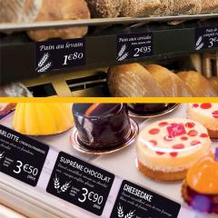 Renforcez l’aspect authentique et uniforme de vos étals et panetières avec des étiquettes de prix entièrement personnalisables : logo de votre enseigne, nom du produit, composition, prix…