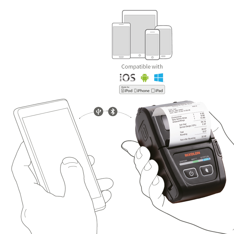 Conçue avec la technologie éprouvée d'impression de reçus de BIXOLON, l'imprimante mobile SPP-C200 de 2 pouces (58 mm), de format de poche et d'un bon rapport qualité-prix, prend en charge des rouleaux de support d'un diamètre allant jusqu'à 40 mm. Dotée d'une batterie monocellulaire de 3000 mAh, la SPP-C200 permet un fonctionnement à long terme pour les travailleurs sur le terrain, quel que soit le secteur d'activité. Idéale pour les preuves de livraison, les paiements mobiles et bien plus encore...