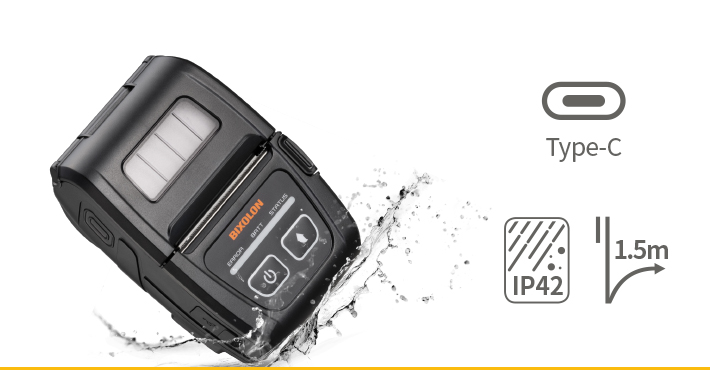 De plus, une connectivité fiable avec les périphériques hôtes via USB et Bluetooth®. Avec la prise en charge du chargement et du transfert de données via les câbles universels Type-C®, la SPP-C200 offre une convivialité exceptionnelle. Conçus pour résister à des chutes multiples de 1,5 m (5 pieds), tout en offrant un indice de protection IP42. Une large gamme de pilotes et de SDK pour les principaux systèmes d'exploitation, notamment iOS™, Android™ et Windows®, ainsi que les logiciels d'impression web/mobile sont pris en charge.