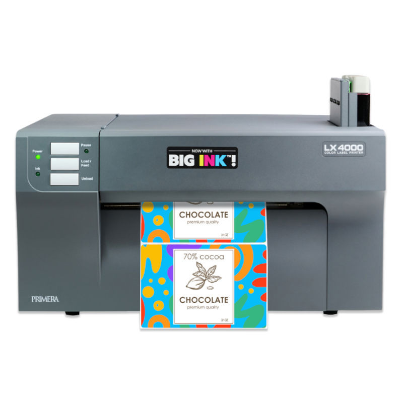 L'imprimante d'étiquettes couleur LX4000e avec Big Ink utilise la même plate-forme éprouvée et fiable que l'imprimante d'étiquettes couleur LX910e populaire de Primera, mais avec l'ajout de grands réservoirs d'encre individuels et d'une tête d'impression à jet d'encre thermique réutilisable.