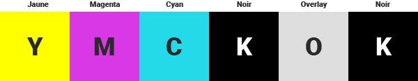Ce ruban est composé de 6 panneaux : Jaune, Magenta, Cyan, Noir, Overlay et Noir.