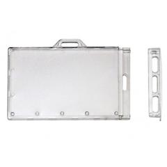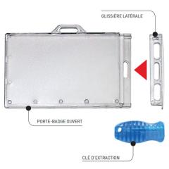 Porte-badge à glissière. Avec le porte-badge à glissière de verrouillage, il suffit de déverrouiller le clapet de protection latérale pour récupérer le ou les 2 badges.