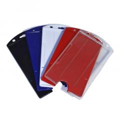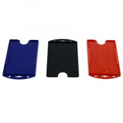 Porte badge en ABS protection 1 face avec perforation oblongue au centre, avec arrondi pour clip IDP 14, et 2 trous ronds latéraux. Dispositif d'accroche pour épingle de sûreté et accrochage sur rack mural.