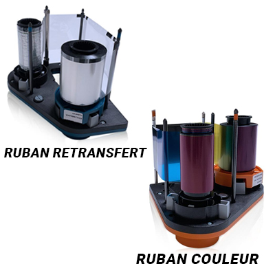 Les imprimantes à retransfert nécessitent l'achat de rubans d'impression, de films de retransfert pour fonctionner. Le film de retransfert est le support sur lequel le ruban imprime. Ce film est ensuite appliqué sur la carte elle-même. Cela permet aux imprimantes à retransfert de produire des cartes plus durables, protégées contre les produits de nettoyage, les rayures, la saleté et autres formes d'usure.