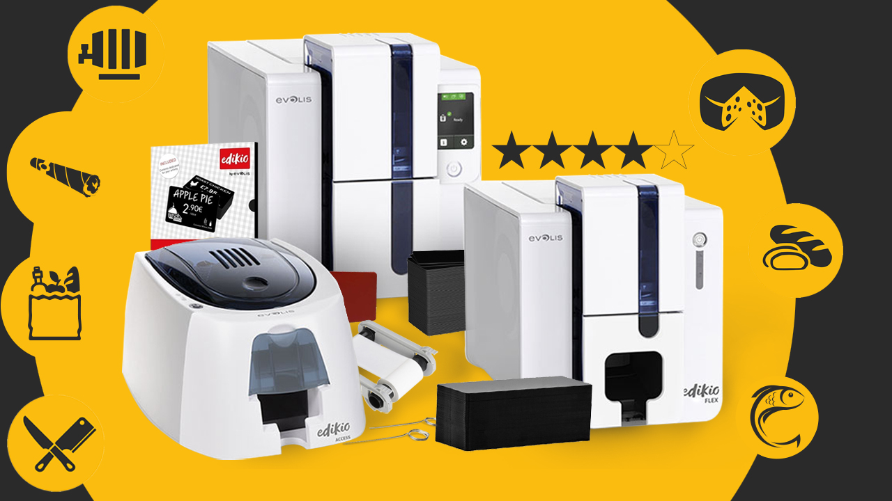 Le fabricant Evolis les définit comme « Spécialement conçues pour répondre aux besoins des commerçants, hôteliers et restaurateurs, les solutions Edikio vous permettent de créer facilement des étiquettes de prix, des étiquettes de buffets et tout type de cartes esthétiques et pratiques sur cartes plastiques. ». Concrètement, cette imprimante à installer dans votre établissement vous permet l'impression immédiate de vos étiquettes, parmi des modèles préconçus et entièrement personnalisables via un logiciel de création intuitif Edikio Access, Flex, Duplex.